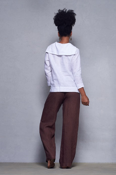 La blusa Navy es una versión contemporánea del clásico estilo marinero, que aporta encanto y frescura a la mujer moderna. Hecha 100 % de lino teñido a mano, presenta cuello cuadrado, corte holgado y un delicado lazo delantero que le da un toque femenino.