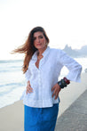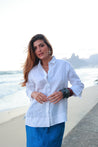 Con un corte ligeramente más holgado y recto, realza la silueta sin sacrificar la ligereza. Su diseño incluye cuello clásico, botones delanteros de nácar natural y mangas 3/4, lo que ofrece versatilidad para todo tipo de looks, desde sofisticados hasta conjuntos informales de verano.