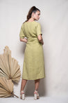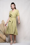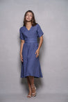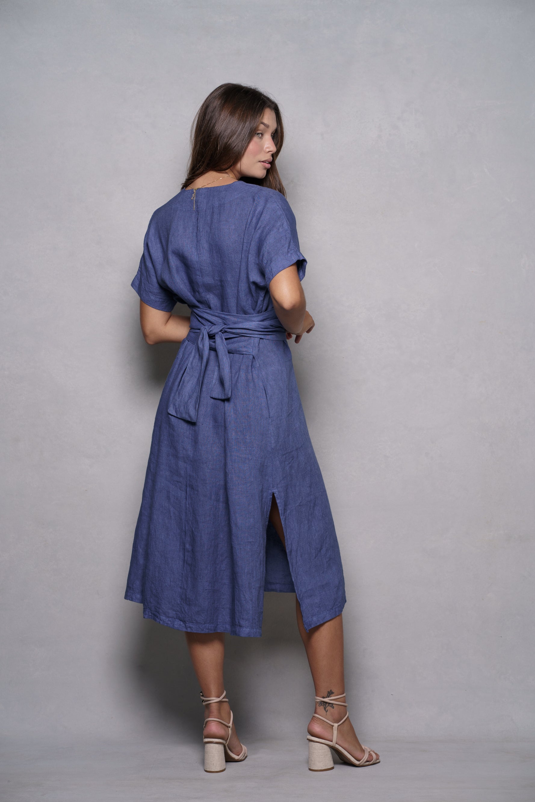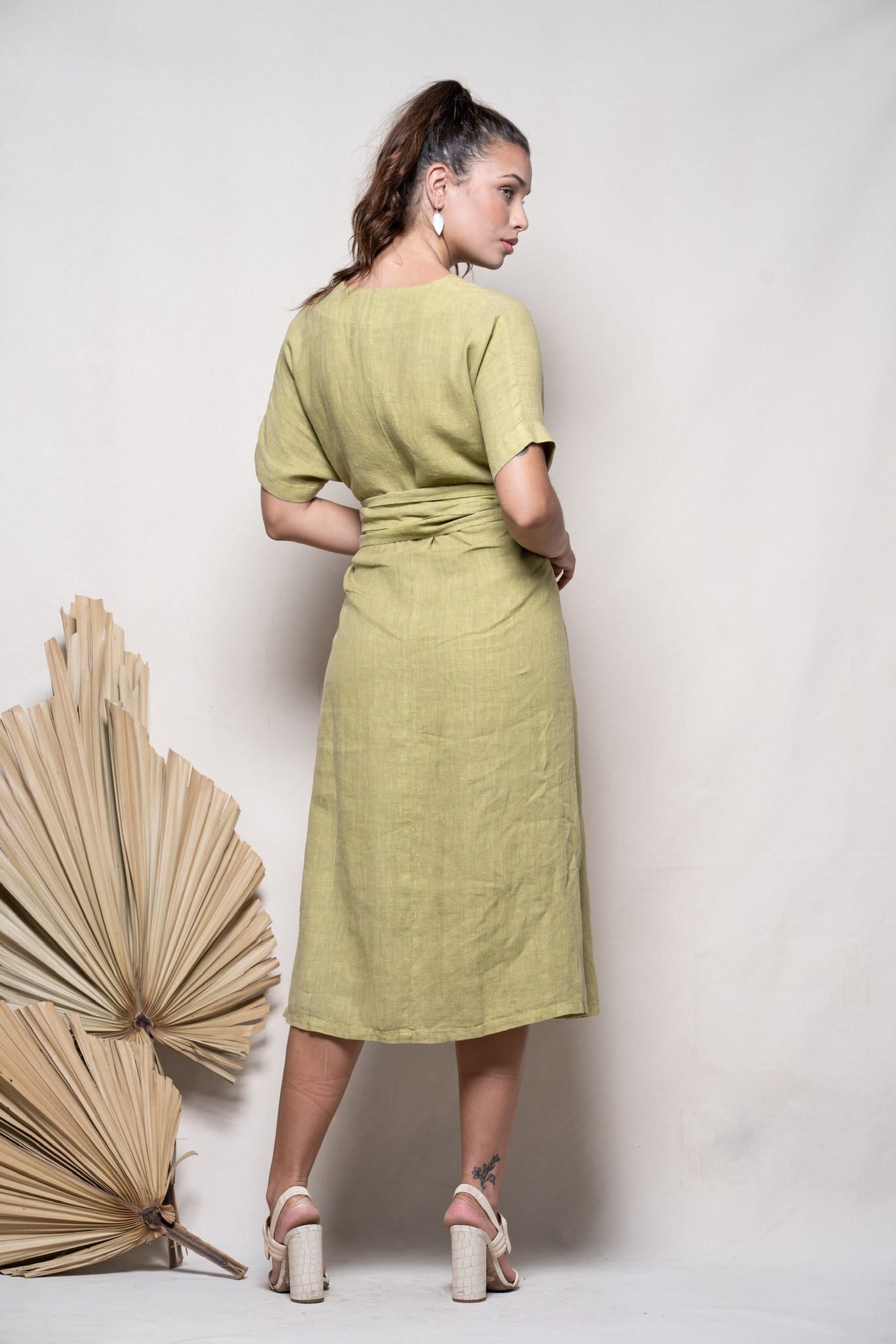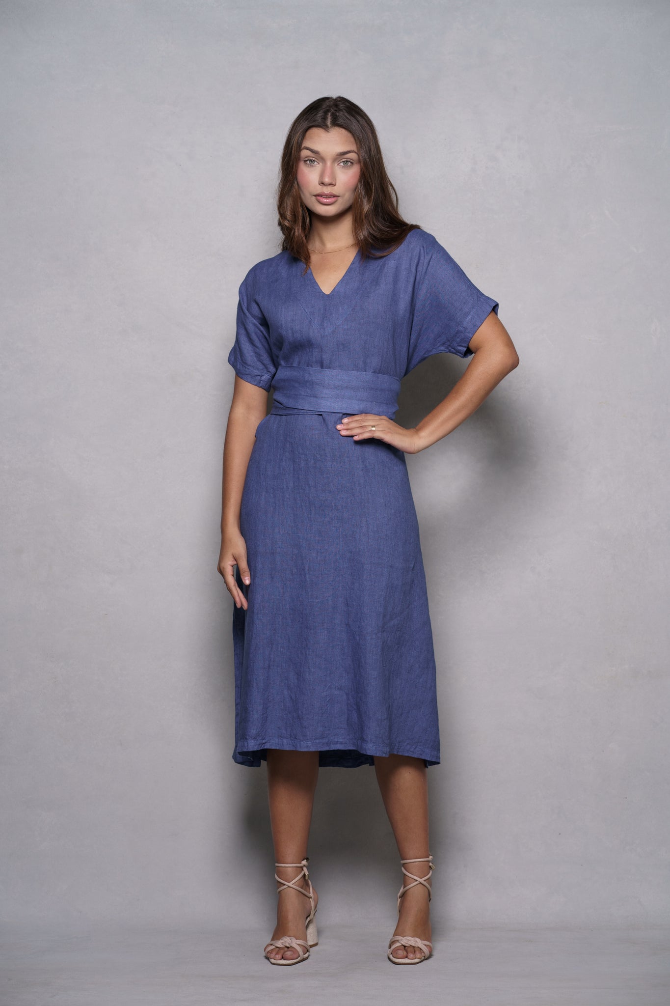 El vestido Sicília es la máxima expresión de elegancia y versatilidad. Confeccionado en lino puro, que proporciona una sensación natural y una caída fluida, es ideal para ocasiones especiales. Su diseño incluye mangas japonesas, que ofrecen un aspecto refinado y cómodo, a la vez que permiten libertad de movimiento, contribuyendo a una estética sofisticada sin resultar recargado. El corte ajustado a la cintura acentúa la silueta femenina, mientras que la falda midi se ensancha con gracia hasta la pantorrilla. El ajuste es excelente, ofreciendo un look sofisticado y equilibrado. Su profundo escote en V es un sutil detalle que alarga y realza el cuello y el busto con elegancia, aportando un toque de refinamiento al diseño. Prácticos y discretos, los bolsillos laterales añaden un toque funcional al vestido, haciéndolo aún más versátil. Es ideal para eventos donde la sofisticación es esencial, combinando la calidad del lino puro con un diseño sofisticado.