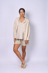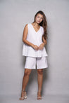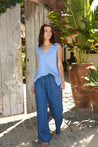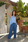 Our Salinas blouse, crafted in pure linen, combines freshness, lightness, and sophistication. Its clean design features a V-neckline in the front and back that accentuates the décolletage and shoulders in an elegant and feminine way. The flowing cut provides comfort without sacrificing a flawless fit, delicately draping the body and lending the piece natural movement. Pair it with linen Bermuda shorts for a light and casual look, finishing with flat sandals—perfect for outdoor strolls or a casual lunch. For more formal settings, wear it with linen pants or skirts in neutral tones, block sandals, and minimalist accessories. Complete with a lightweight blazer for a more elegant and professional look. For an evening option, opt for silk pantaloons, thin-strap heeled sandals, and a touch of sparkle in your accessories for a sophisticated look.