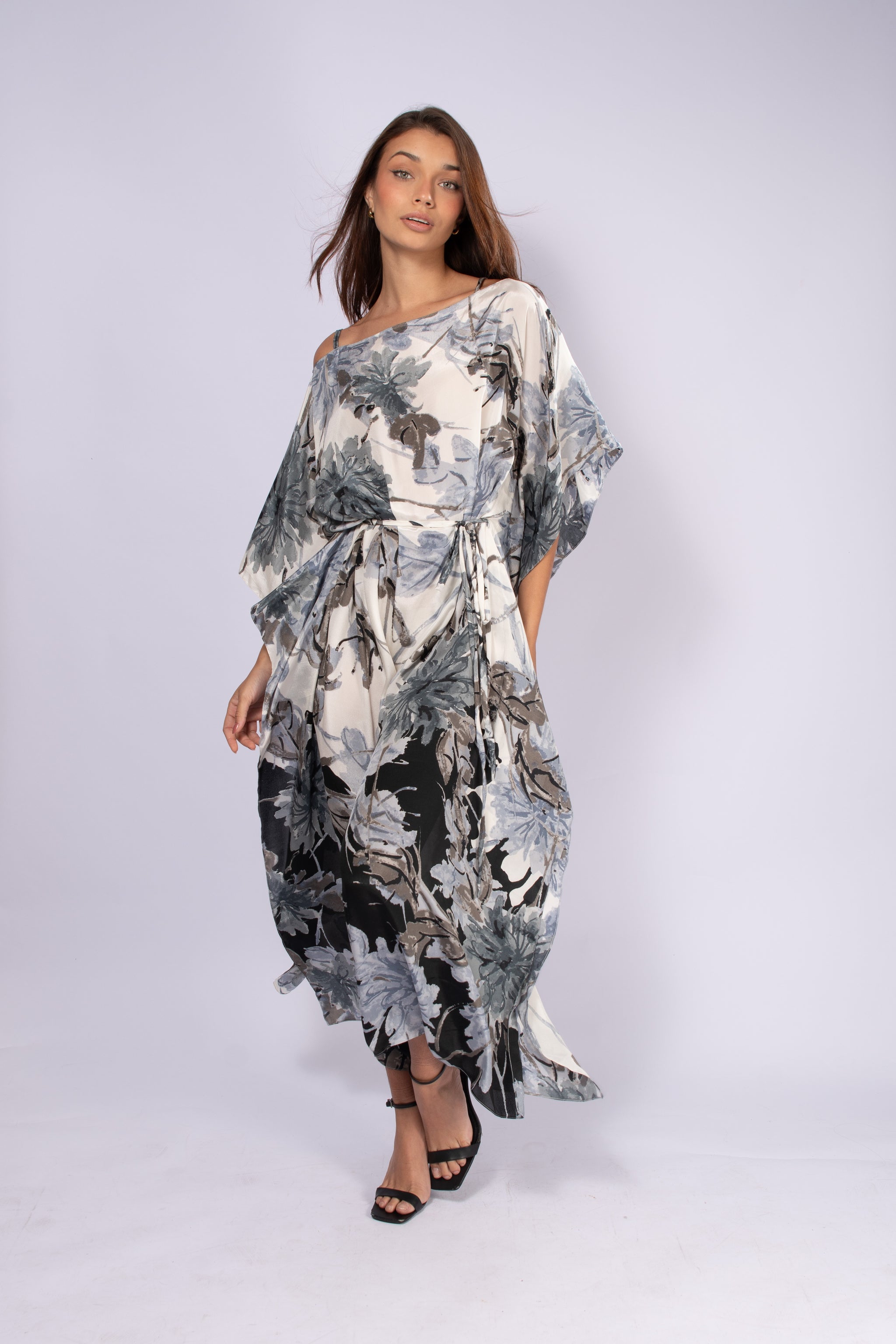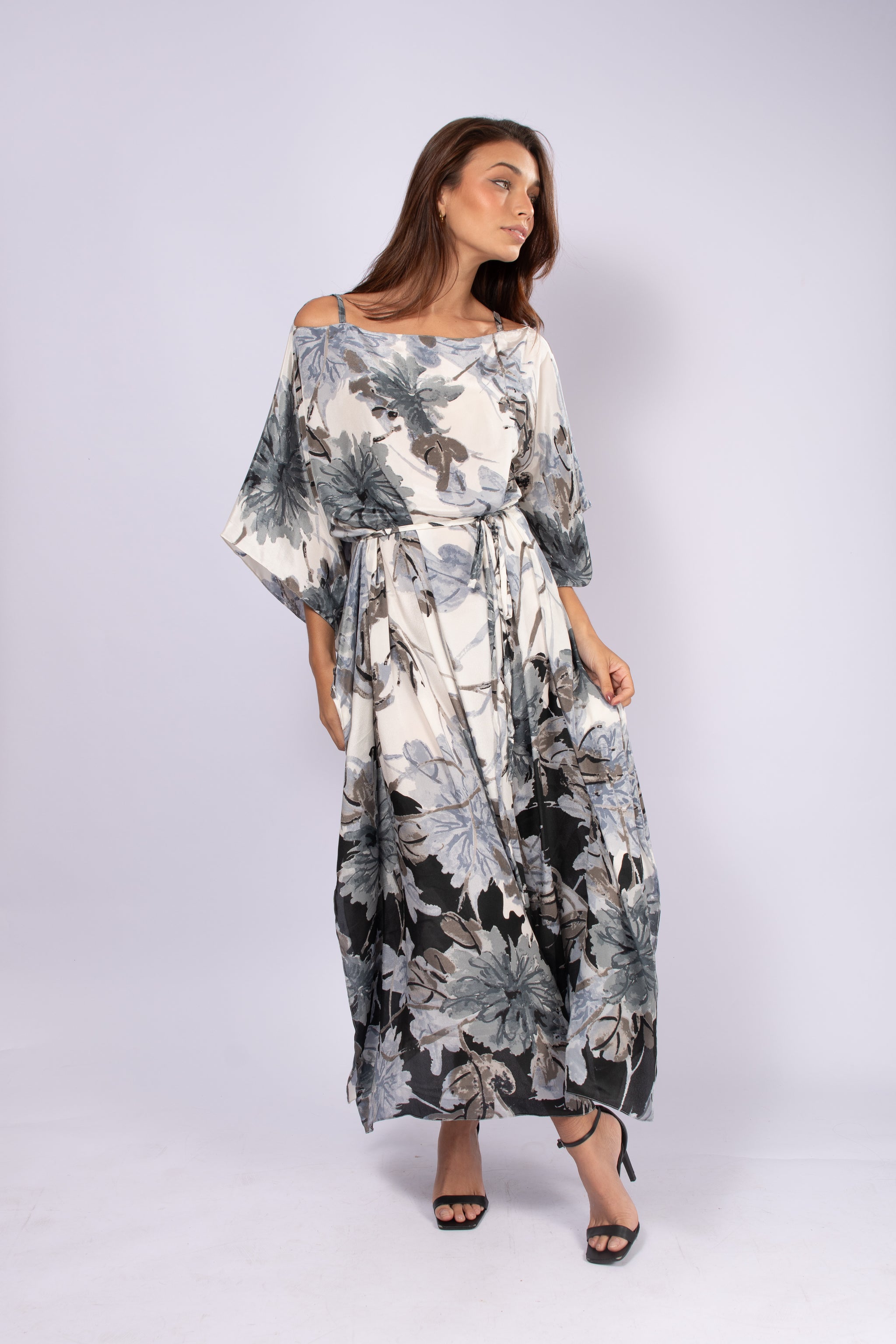 Embrace the natural elegance of the Java Kaftan, where the soft combination of white, gray, and black transforms into a sophisticated play of contrast with a leaf print. The harmony between neutrality and organic movement creates a striking, contemporary presence.
